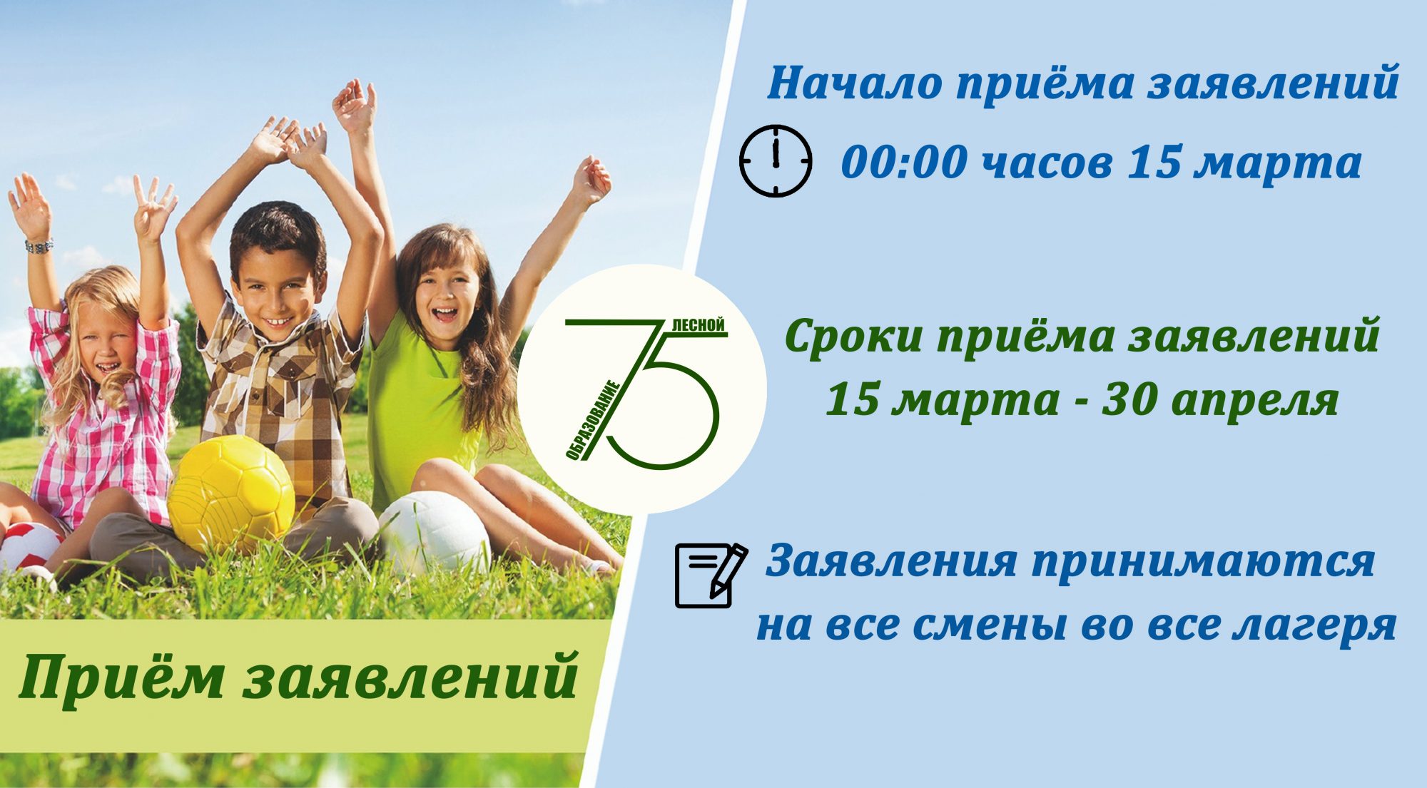 Заявления принимаются в период с 15 марта по 30 апреля на все смены во все лагеря.