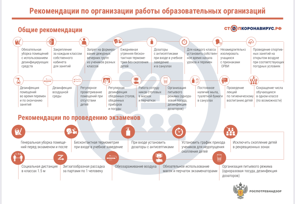 Порядок организации образовательного процесса определен Санитарно-эпидемиологическими правилами СП 3.1/2.4.3598-20 «Санитарно-эпидемиологические требования к устройству, содержанию и организации работы образовательных организаций и других объектов социальной инфраструктуры для детей и молодежи в условиях распространения новой коронавирусной инфекции (COVID-19)» (утверждены постановлением Главного государственного санитарного врача РФ от 30.06.2020 N 16) и рекомендациями Федеральной службы по надзору в сфере защиты прав потребителей и благополучия человека по организации работы образовательных организаций в условиях сохранения рисков распространения COVID-19, утвержденных Главным государственным санитарным врачом Российской Федерации 8 мая 2020 года (письмо Роспотребнадзора РФ от 08.05.2020 №02/8900-2020-24).