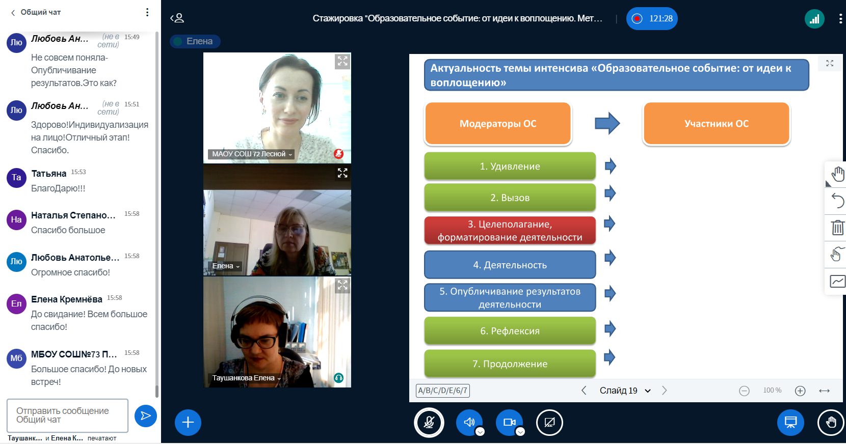 18-19 апреля в рамках проекта Института развития образования “Образовательный тур” команда школы №72 провела региональную онлайн-стажировку с презентацией опыта по теме “Образовательное событие: от идеи к воплощению. “Метод значимой даты” как инструмент обучения и воспитания школьников”.