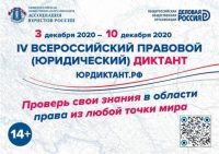 С 3 по 10 декабря 2020 года в целях оценки уровня правовой грамотности населения пройдет Четвертый Всероссийский правовой (юридический) диктант. Соорганизаторами Диктанта выступают Общероссийская общественная организация «Ассоциация юристов России» и Общероссийская общественная организация «Деловая Россия» при поддержке Федерального государственного бюджетного образовательного учреждения высшего образования «Московский государственный юридический университет имени О.Е. Кутафина (МГЮА)».